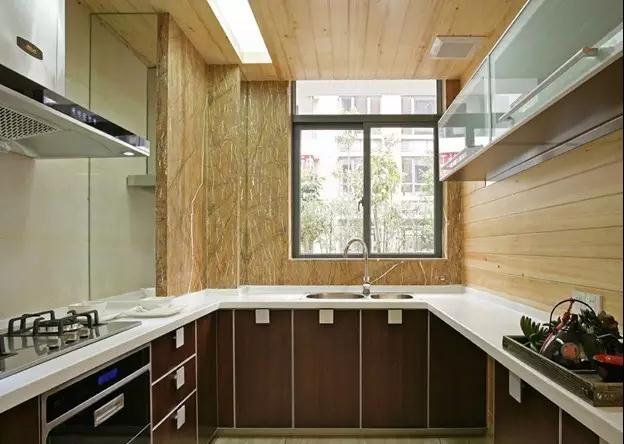 U型櫥柜設(shè)計(jì)儲(chǔ)物功能大,左邊吊柜統(tǒng)一采用開放柜與封閉柜不僅美觀,而且方便擺放和儲(chǔ)藏物體,棕色背景與面板形成呼應(yīng),使空間更為溫馨、自然。