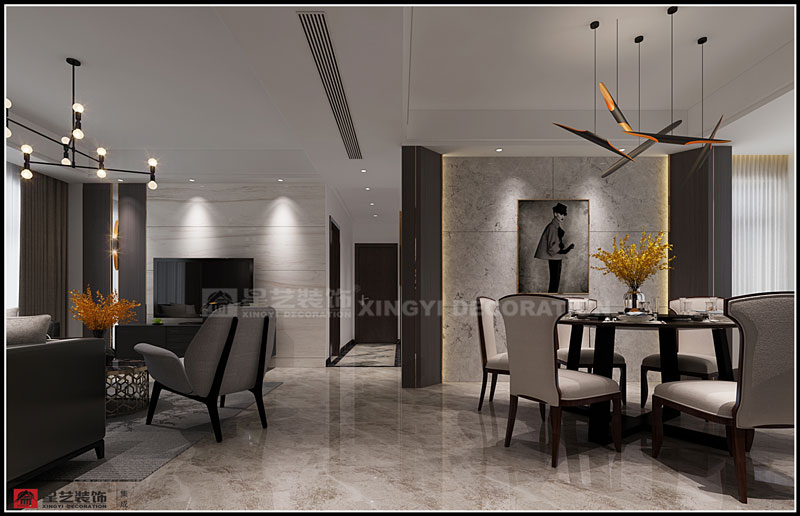 本案為港式簡約風(fēng)、空間以冷色調(diào)為主,線條明亮硬朗,以制作精良的柔和軟裝來協(xié)調(diào)緩和空間的“冷”氛圍,使得看上去既有質(zhì)感,又不失一個(gè)家的溫馨。