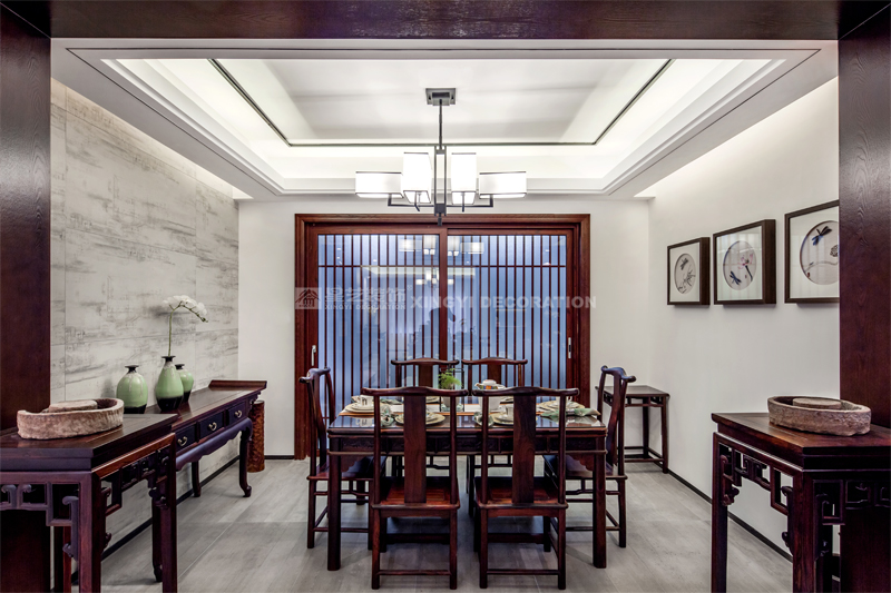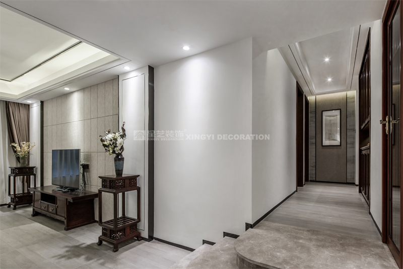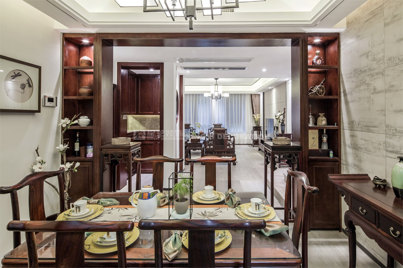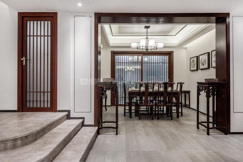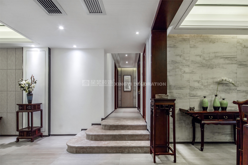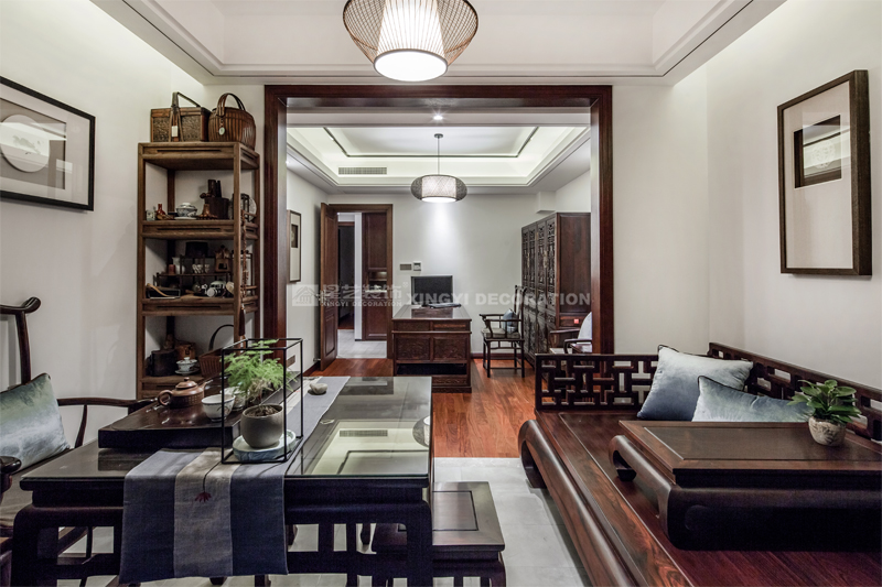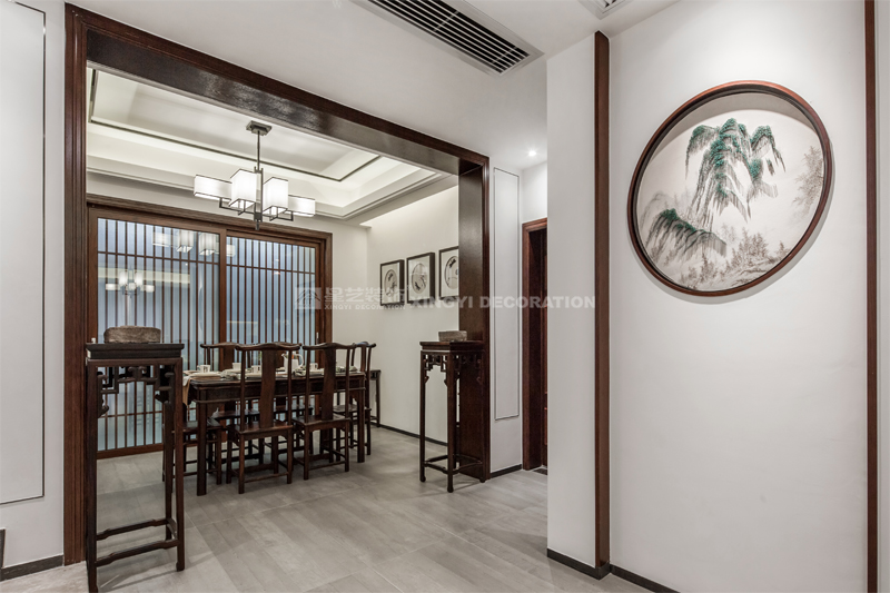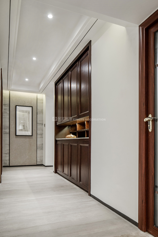 業(yè)主是個(gè)十分看重文化底蘊(yùn)的人,所以比較偏愛新中式風(fēng)格設(shè)計(jì),因此設(shè)計(jì)師在設(shè)計(jì)時(shí)需要用有限的空間設(shè)計(jì)出無限的意境,把業(yè)主的古典情懷表現(xiàn)出來。靈動(dòng)飄逸的盆景搭配古香古色的原木家具、考究方正的中式燈飾和淡雅別致的水墨畫飾等,將新中式的神韻烘托得淋漓盡致,不僅極具質(zhì)感,還將整個(gè)空間的意境提升了不少。入戶過道處設(shè)計(jì)得極為簡約,硬朗的線條將空間分割得極為方正,搭配上淡色的畫飾,將空間的延續(xù)性無限拉長。“時(shí)得悠然意,一拋名和利。茶香品斜陽,塵心難自還?!辈栝g的設(shè)計(jì)更能讓業(yè)主在紛擾的繁世中辟得一處幽靜之地,讓疲勞的心靈有所歸宿。