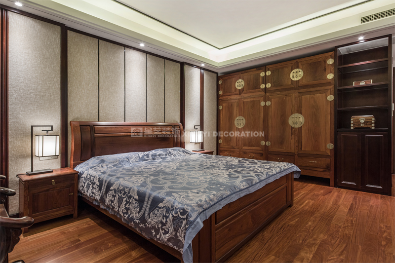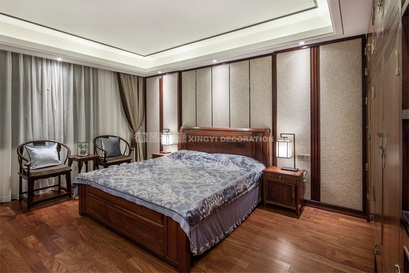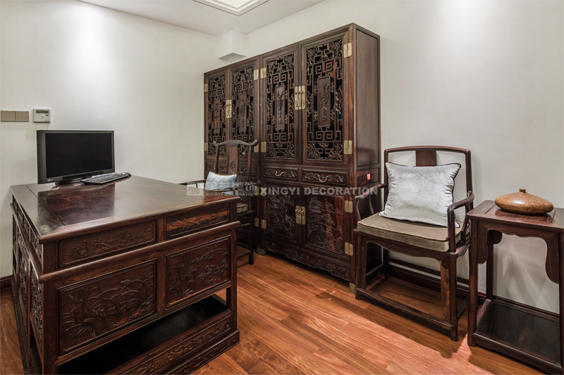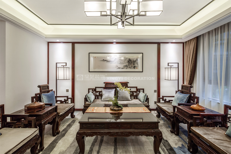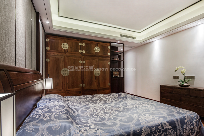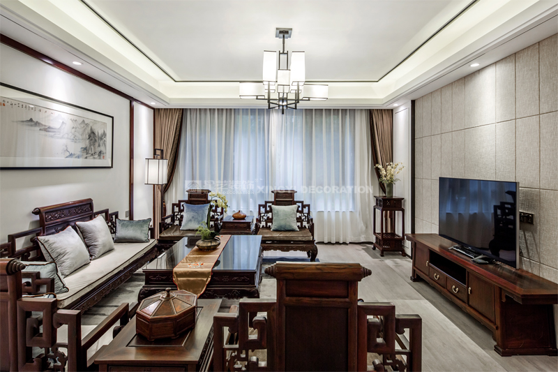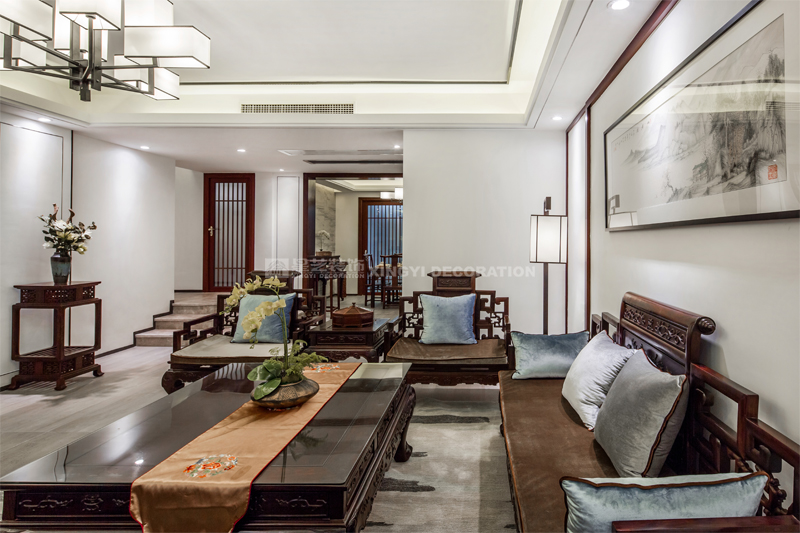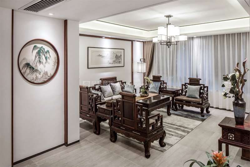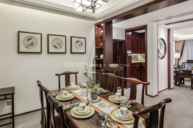 業(yè)主是個(gè)十分看重文化底蘊(yùn)的人,所以比較偏愛新中式風(fēng)格設(shè)計(jì),因此設(shè)計(jì)師在設(shè)計(jì)時(shí)需要用有限的空間設(shè)計(jì)出無限的意境,把業(yè)主的古典情懷表現(xiàn)出來。靈動(dòng)飄逸的盆景搭配古香古色的原木家具、考究方正的中式燈飾和淡雅別致的水墨畫飾等,將新中式的神韻烘托得淋漓盡致,不僅極具質(zhì)感,還將整個(gè)空間的意境提升了不少。入戶過道處設(shè)計(jì)得極為簡約,硬朗的線條將空間分割得極為方正,搭配上淡色的畫飾,將空間的延續(xù)性無限拉長。“時(shí)得悠然意,一拋名和利。茶香品斜陽,塵心難自還?!辈栝g的設(shè)計(jì)更能讓業(yè)主在紛擾的繁世中辟得一處幽靜之地,讓疲勞的心靈有所歸宿。