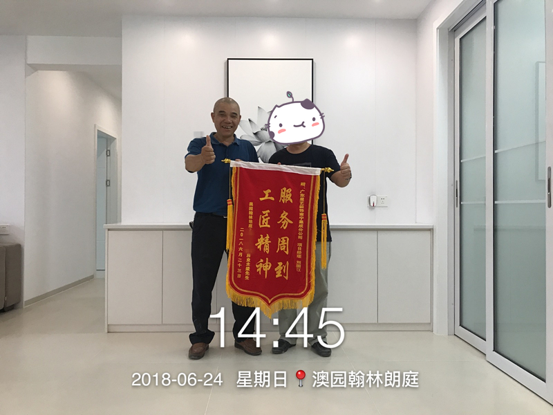 2018年6月23日,奧園瀚林朗庭業(yè)主送來錦旗稱贊廣東星藝裝飾南寧公司項目經(jīng)理劉國江工匠精神,服務(wù)周到。
