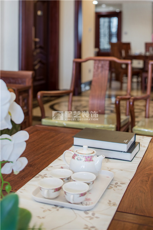 建材:大理石、訂制家具、壁紙、木通花、硅藻泥、銅質吊燈、木地板。