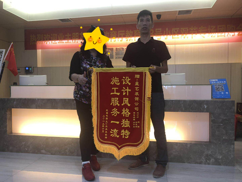 2019年10月,又一位天譽花園的業(yè)主送來錦旗,這是設(shè)計師陳忠波 項目監(jiān)理 周平亮近一個月收到的第二面錦旗,錦旗內(nèi)容:施工服務(wù)一流 設(shè)計風格獨特