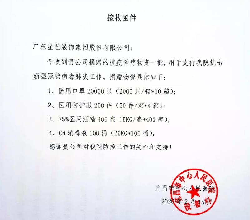 2月16日上午,廣東星藝裝飾集團(tuán)組織“愛心車隊(duì)”,向湖北宜昌市中心人民醫(yī)院捐贈(zèng)醫(yī)用口罩、防護(hù)服、醫(yī)用酒精等愛心物資馳援抗疫一線。