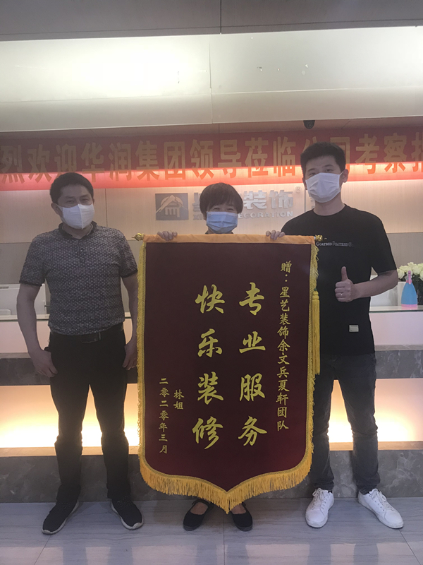 業(yè)主林姐為感謝項目經(jīng)理余文兵和設(shè)計師夏軒,專程來星藝送錦旗,感謝項目經(jīng)理和設(shè)計師的認真負責。認真工作一定會獲得認可的,我們一定還會繼續(xù)努力提升自己的工作服務