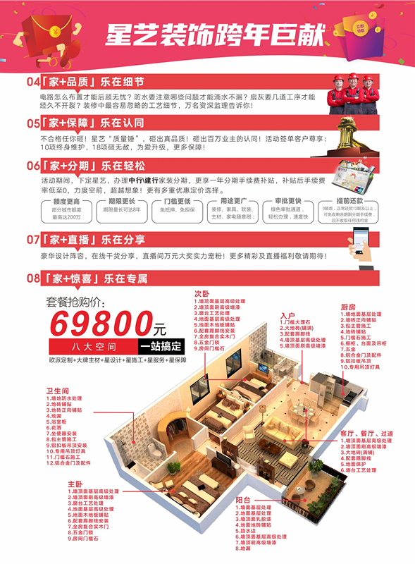 8、星藝裝飾·集成套餐工程,包得更多、更全面、更真實(shí)!星藝裝飾·集成套餐比市面套餐多包的項(xiàng)目:門檻石、櫥柜、燈、衛(wèi)生間、包管、防水等項(xiàng)目直接成本在2萬(wàn)元以上