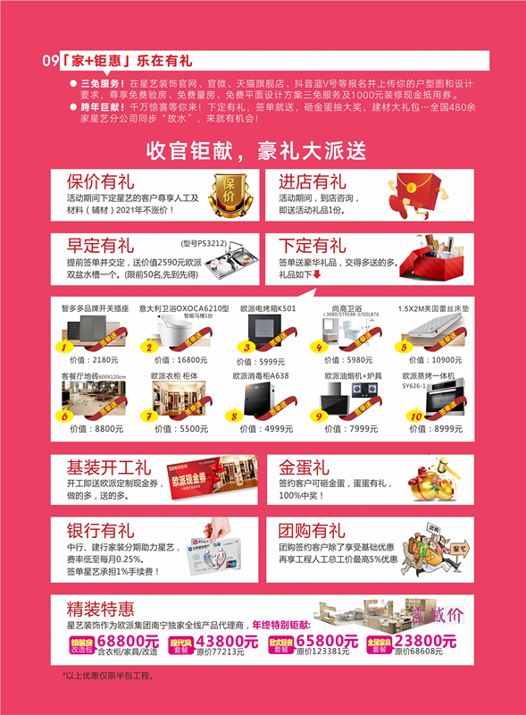 活動(dòng)期間業(yè)主搶訂成功樣板間工程可全程享受:1.首席設(shè)計(jì)師全程設(shè)計(jì)2.五星項(xiàng)目經(jīng)理全程施工。3.金牌項(xiàng)目監(jiān)理全程監(jiān)工。4.總經(jīng)辦工地監(jiān)督巡檢。