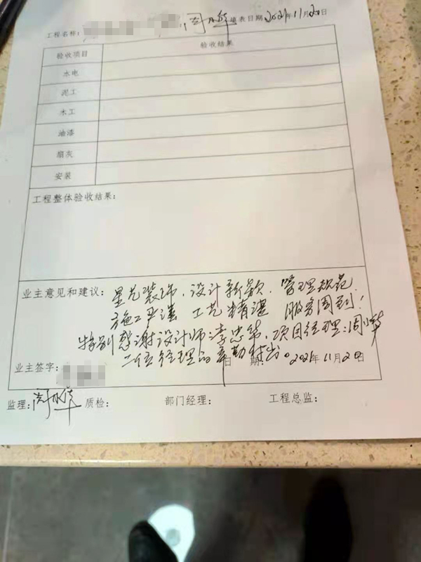 2021年11月20日,碧水天和業(yè)主李先生送來錦旗一幅,感謝星藝裝飾項(xiàng)目經(jīng)理周小平,錦旗內(nèi)容:工藝精湛 周到服務(wù),并在工程項(xiàng)目驗(yàn)收表上手寫寄語表示感謝