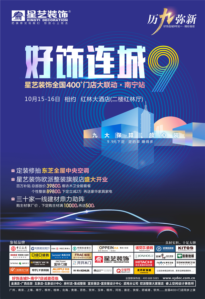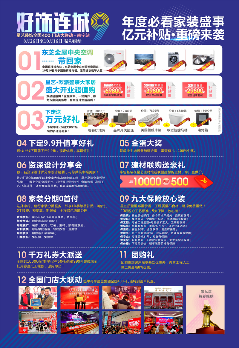 2014年星藝裝飾“好飾連城”全國大聯(lián)動首屆成功舉辦,一年一屆好飾不斷上演,讓星藝旋風(fēng)吹遍全國各地。值此“好飾連城9”再次席卷全國,一線建材品牌廠價助陣,星藝總部+歐派總部聯(lián)合讓利,共同打造一場品質(zhì)家裝盛惠,南寧站具體優(yōu)惠如下: