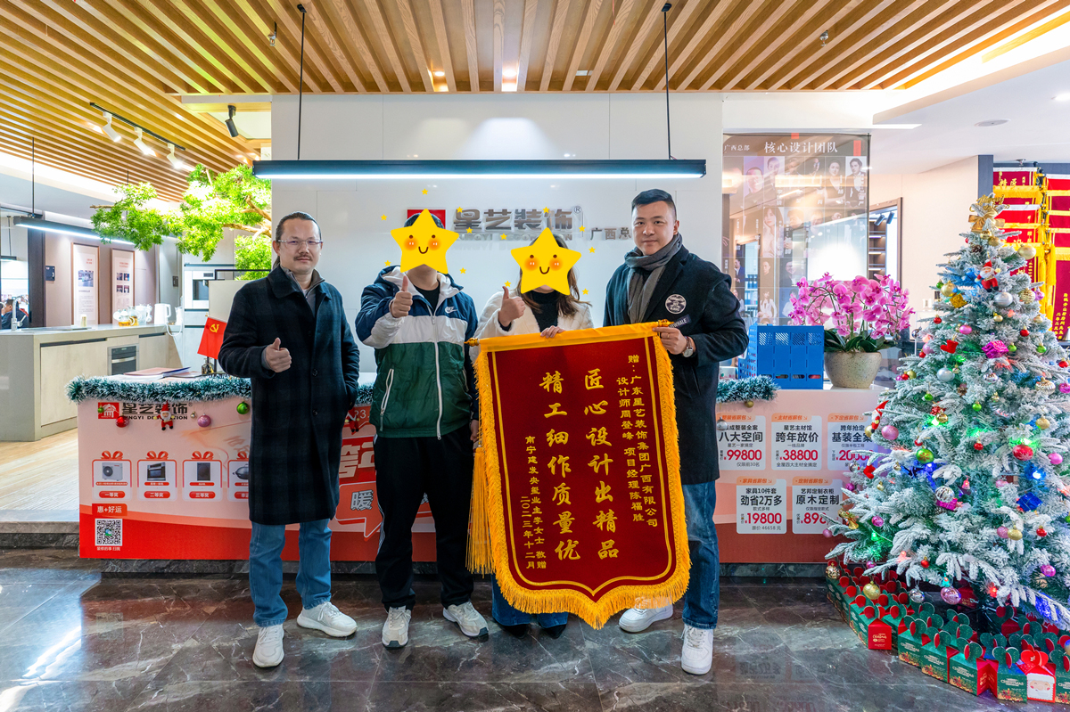 2023年12月24日平安夜當(dāng)天,建發(fā)央璽業(yè)主李女士來到星藝裝飾廣西總部,送上一副錦旗,業(yè)主表示周登峰周工的設(shè)計真的超級贊!十年前我結(jié)婚裝修的時候就是找他設(shè)計的,那時候的設(shè)計風(fēng)格到現(xiàn)在看都還是那么時尚,一點(diǎn)也不過時。這次新房裝修,我還是毫不猶豫地選擇了他,真的是沒有讓我失望!