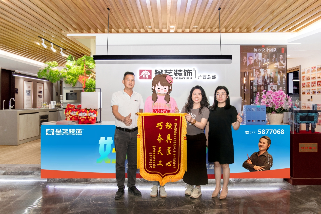 今日,星藝裝飾廣西總部迎來了一段溫馨而榮耀的時刻。金地美域國際小區(qū)的一位業(yè)主特地送來了一幅錦旗,以表彰我們團(tuán)隊(duì)在裝修項(xiàng)目中的卓越表現(xiàn)。這幅錦旗上題寫著“巧奪天工 獨(dú)具匠心”,表達(dá)了業(yè)主對我們工作的高度認(rèn)可和由衷感謝。設(shè)計(jì)師甘盧華和項(xiàng)目經(jīng)理陳希明與業(yè)主共同合影留念,記錄下了這一珍貴的瞬間。
