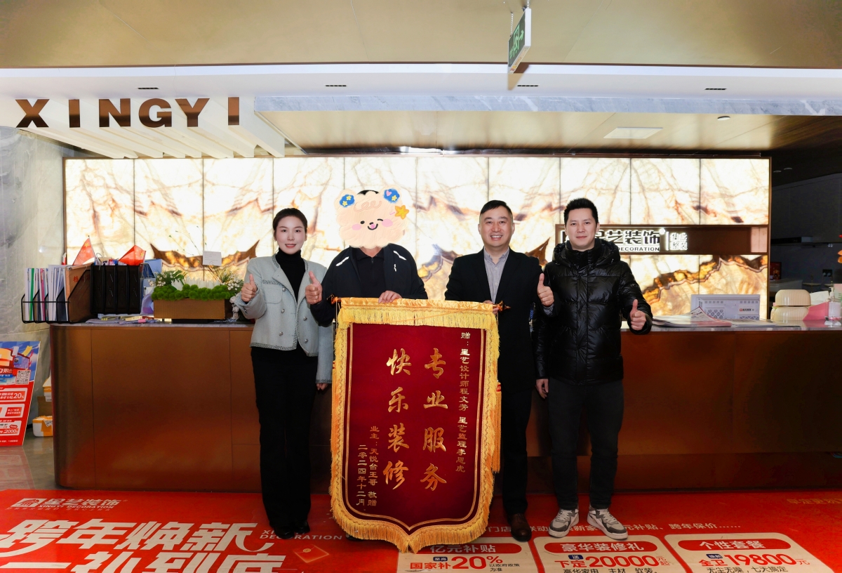 2024年12月24日,平安夜當(dāng)天,南寧星藝裝飾集成整裝館迎來了一段溫馨而榮耀的時刻。保利天悅臺的業(yè)主王哥特地送來了一幅充滿贊譽的錦旗,以表彰我們團(tuán)隊在裝修項目中的卓越表現(xiàn)。這幅錦旗上題寫著“快樂裝修 專業(yè)服務(wù)”,表達(dá)了王哥對我們工作的高度認(rèn)可和由衷感謝。設(shè)計師程文芳、項目經(jīng)理李恩虎與王哥共同合影留念,記錄下了這一珍貴的瞬間。