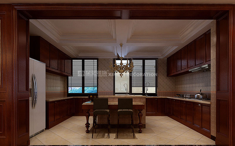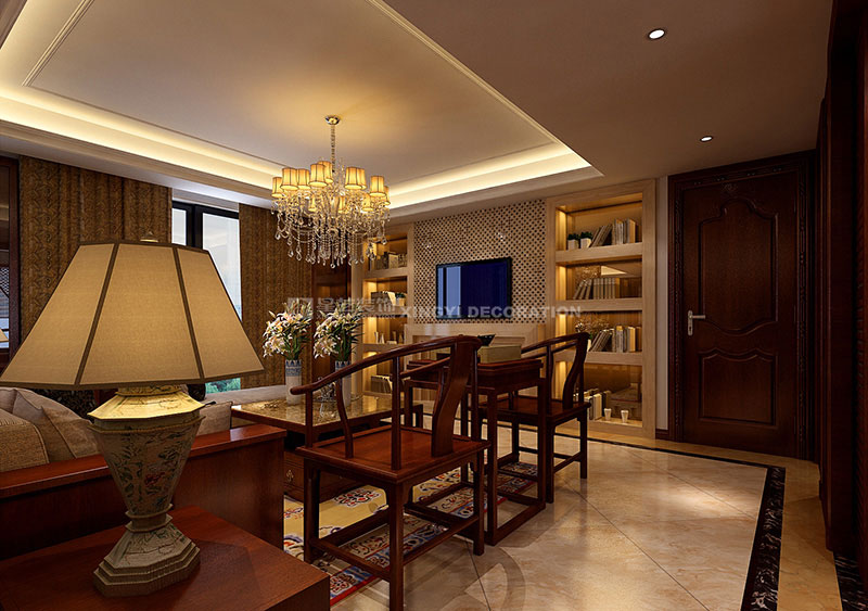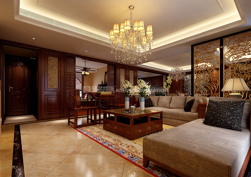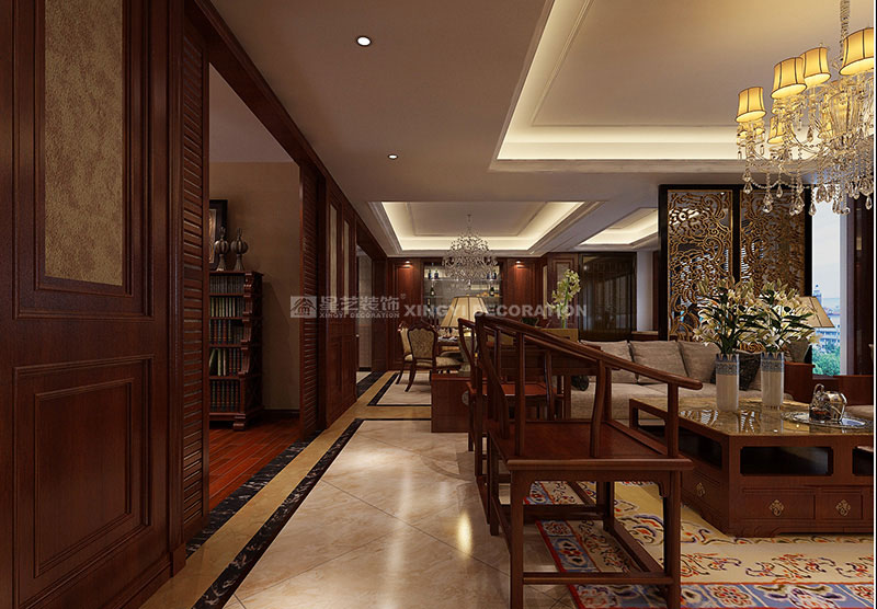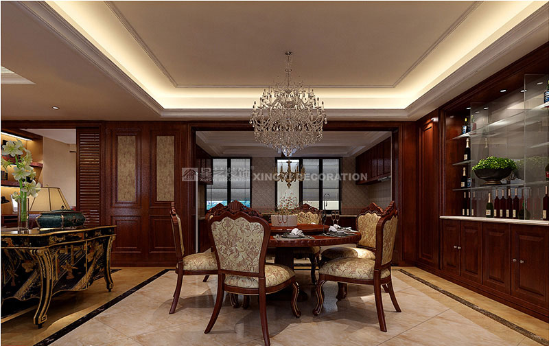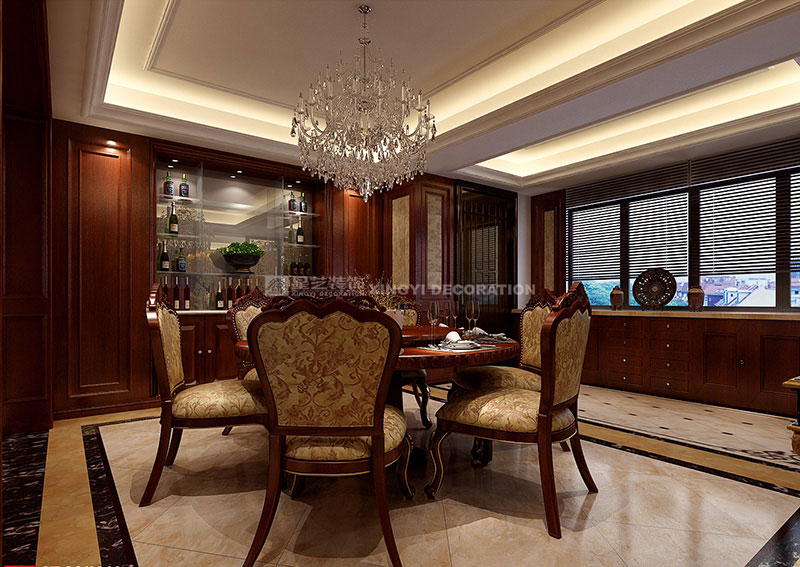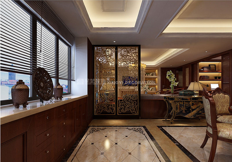 地面采用石材拼花,用石材天然的紋理和自然的色彩來(lái)修飾人工的痕跡。使客廳和餐廳的那種奢華、檔次和品位毫無(wú)保留地流淌。 在家具配置上,多選用板木結(jié)合的實(shí)木家具,家具漆面具有封閉漆效果,不僅能將木皮的紋理盡情展示,在徒手觸摸時(shí),還能感受到油漆飾面后的光滑、平整。
