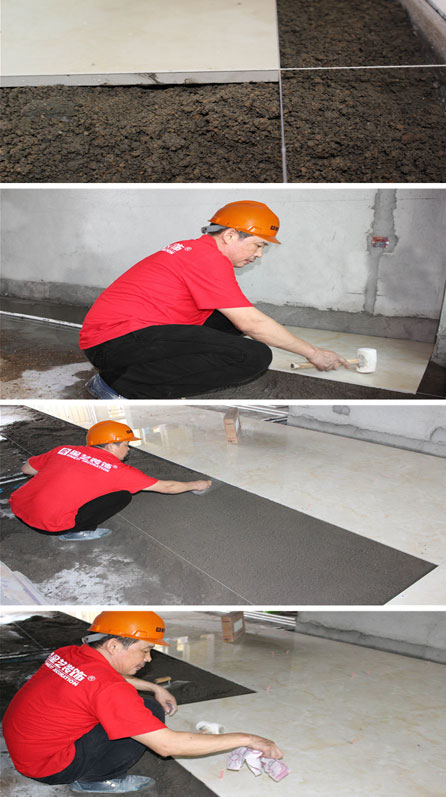 B、先試鋪四塊,(橫豎各鋪兩塊),以此檢查轉(zhuǎn)的角度方正和平整度。