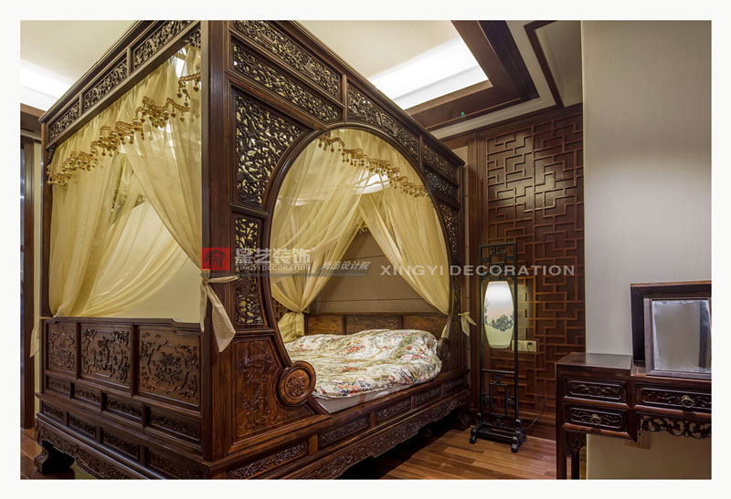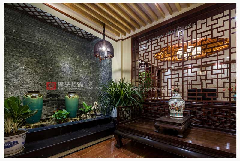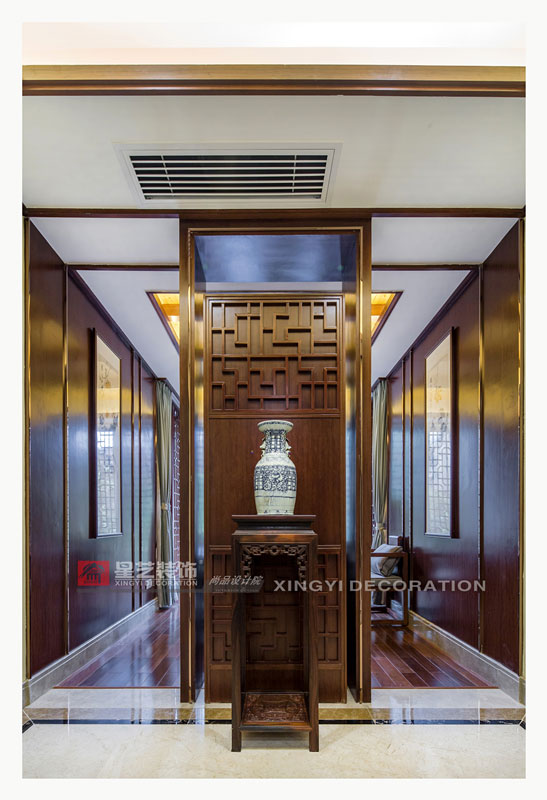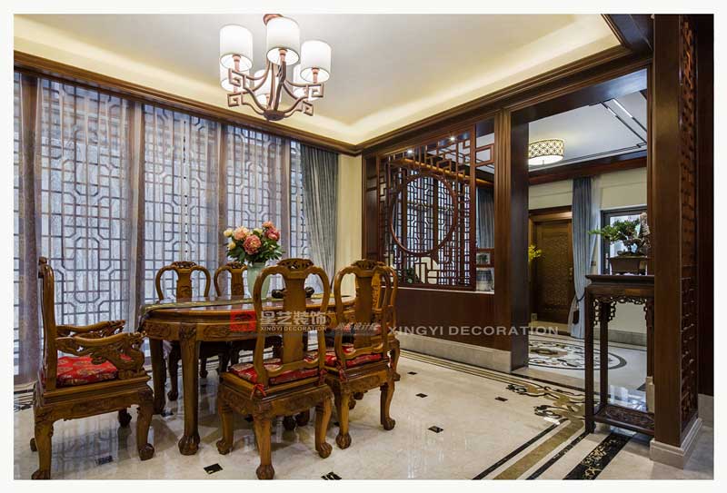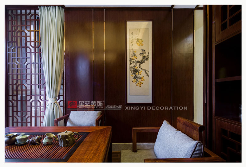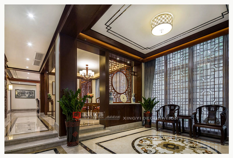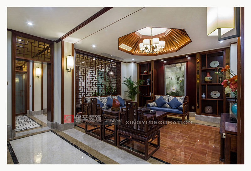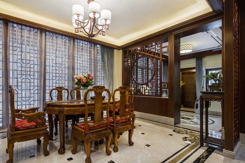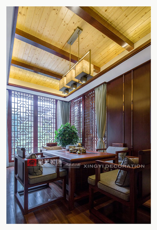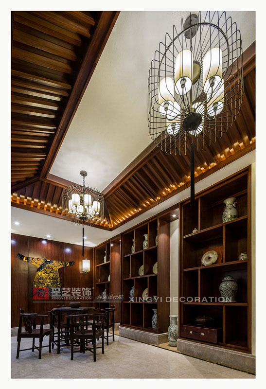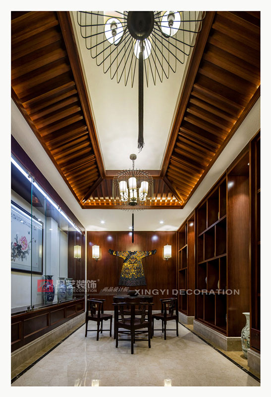 現(xiàn)代中式風(fēng)格并非完全意義上的復(fù)古明清,而是通過(guò)重新演繹中式風(fēng)格的特征,表達(dá)對(duì)清雅含蓄、端莊風(fēng)華的東方式精神境界的追求。因此在設(shè)計(jì)上不僅僅包含了中式的傳統(tǒng)特點(diǎn),還融入了一些現(xiàn)代色彩和燈光處理手法。元素簡(jiǎn)化后的木質(zhì)頂棚造型,既突出了收藏室和品茶區(qū)的文化屬性,又很好的契合了現(xiàn)代的工藝處理。灰藍(lán)色的現(xiàn)代絨面窗簾柔化了紅木家具的渾厚,又在色彩上起到了冷暖對(duì)比的作用,配合LED的隱藏式燈光,使整個(gè)空間溫暖柔和。打破了傳統(tǒng)中式風(fēng)格沉重壓抑的氣息。通過(guò)對(duì)傳統(tǒng)中式木梁的分解重組,設(shè)計(jì)了獨(dú)特的天花斜線木質(zhì)收口系統(tǒng),既融合了如中央空調(diào)管線及LED隱藏?zé)艄獾牟季中枰?,又突出了?jiǎn)練的中式線條造型。而無(wú)處不在的名人字畫(huà)很好地起到了空間點(diǎn)綴的作用,使整個(gè)別墅飄逸著淡淡的文化氣息。