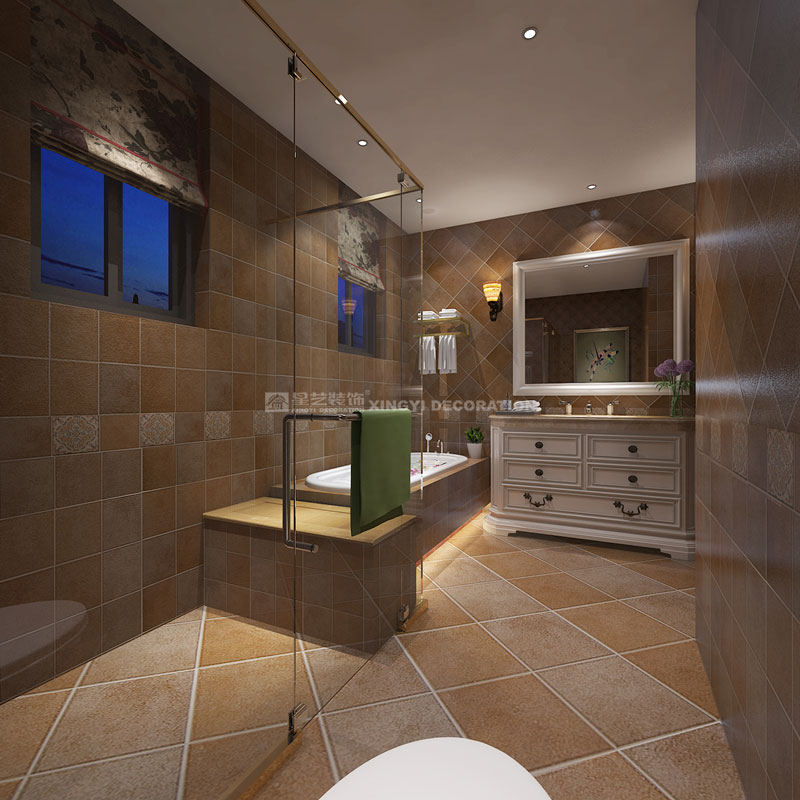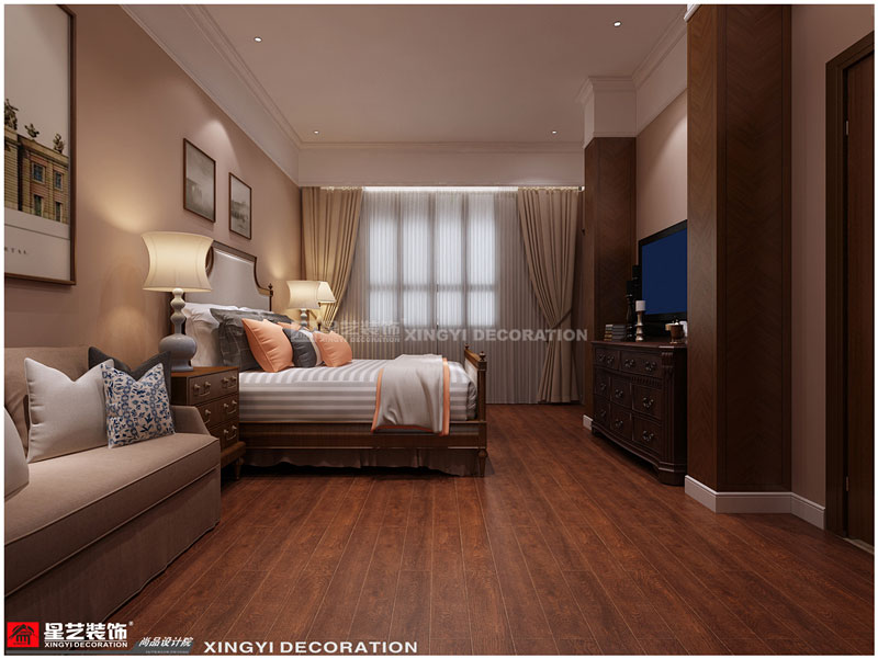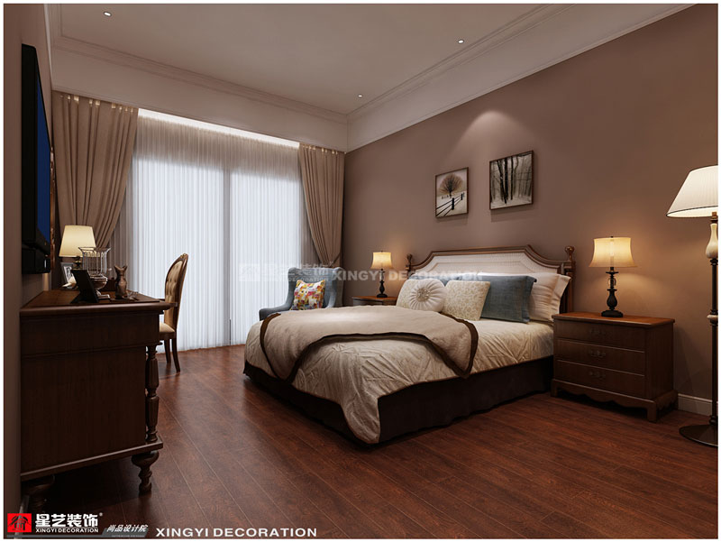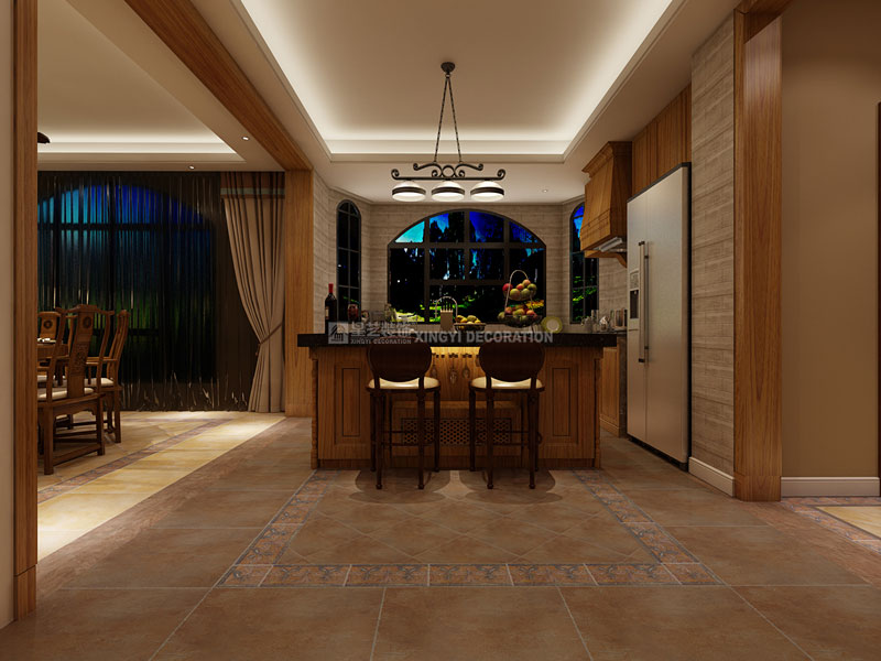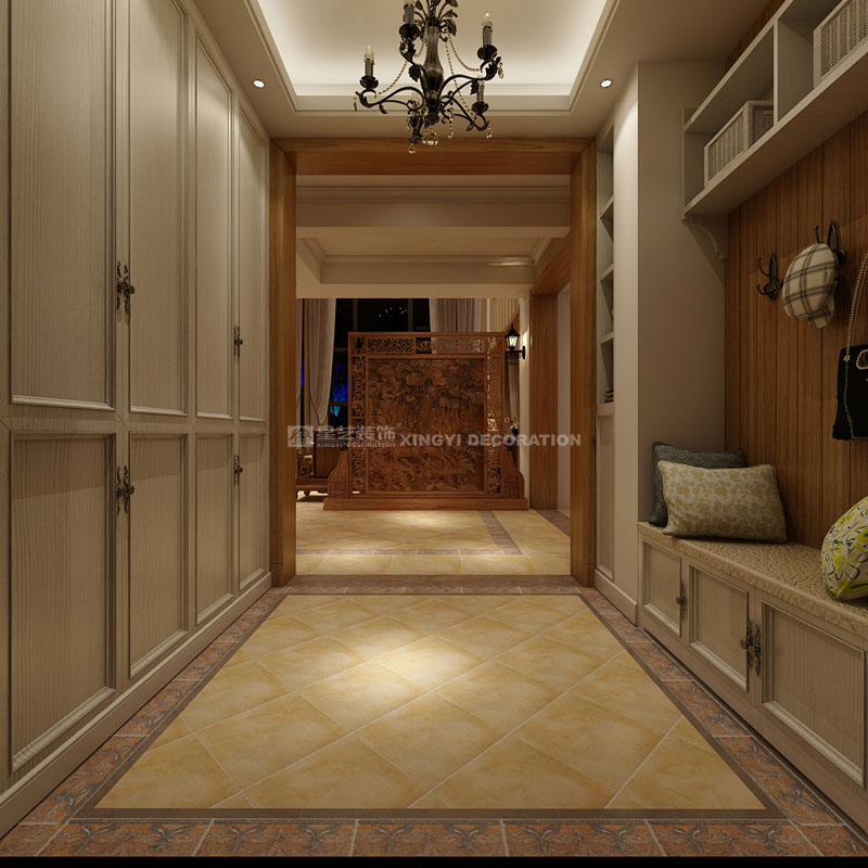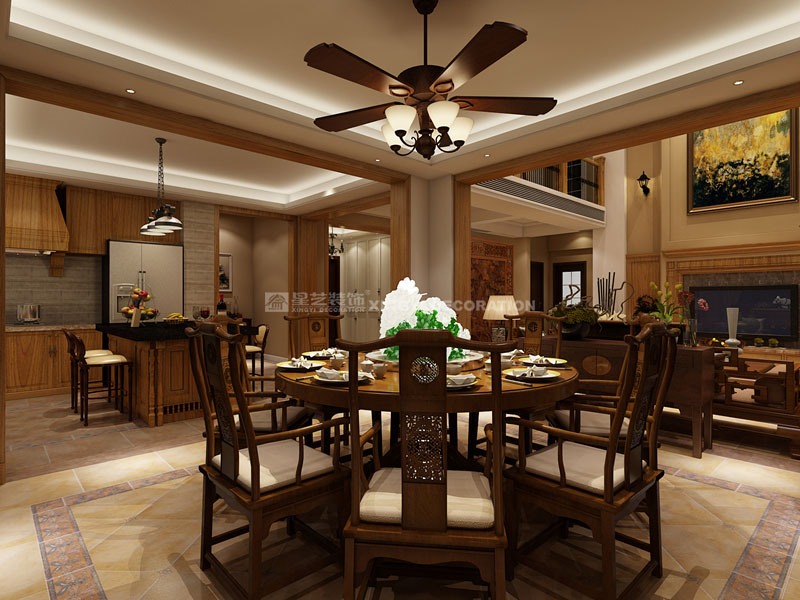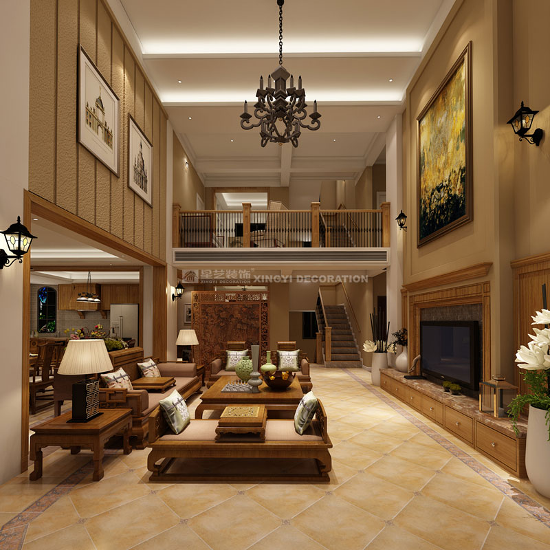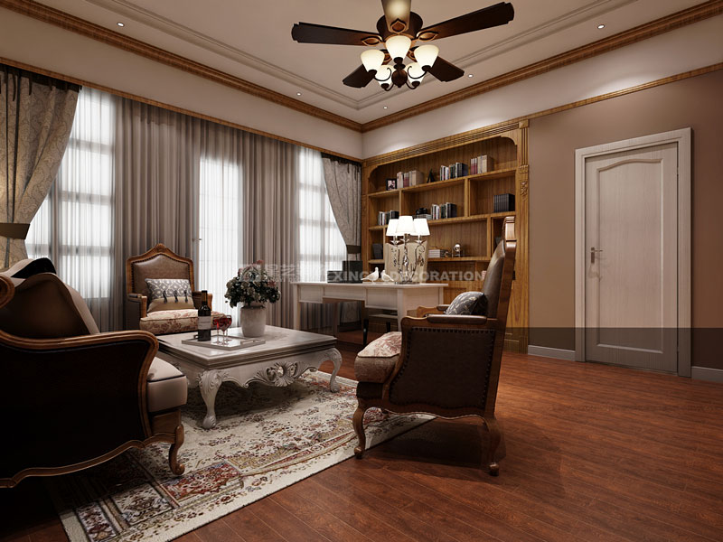 業(yè)主經(jīng)常出國(guó),愛(ài)人小孩都在國(guó)外,并且喜歡打高爾夫球。在整體設(shè)計(jì)上,給定位了自由休閑的美式風(fēng)格,在客廳的設(shè)計(jì)上結(jié)合了中式的韻味,舒適大方。