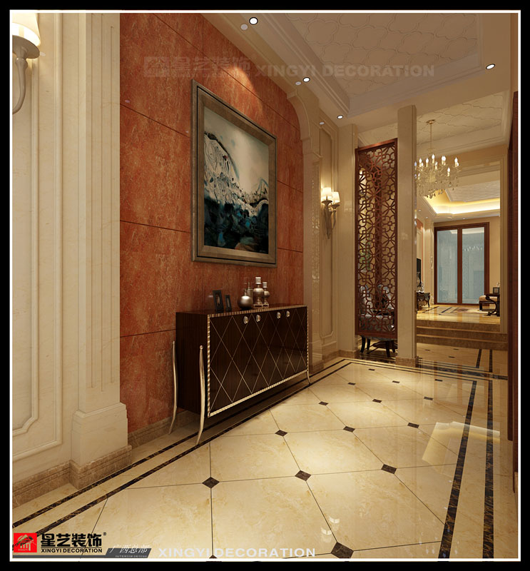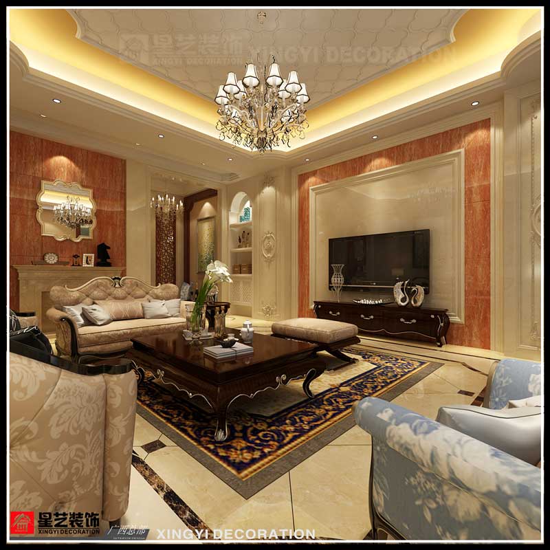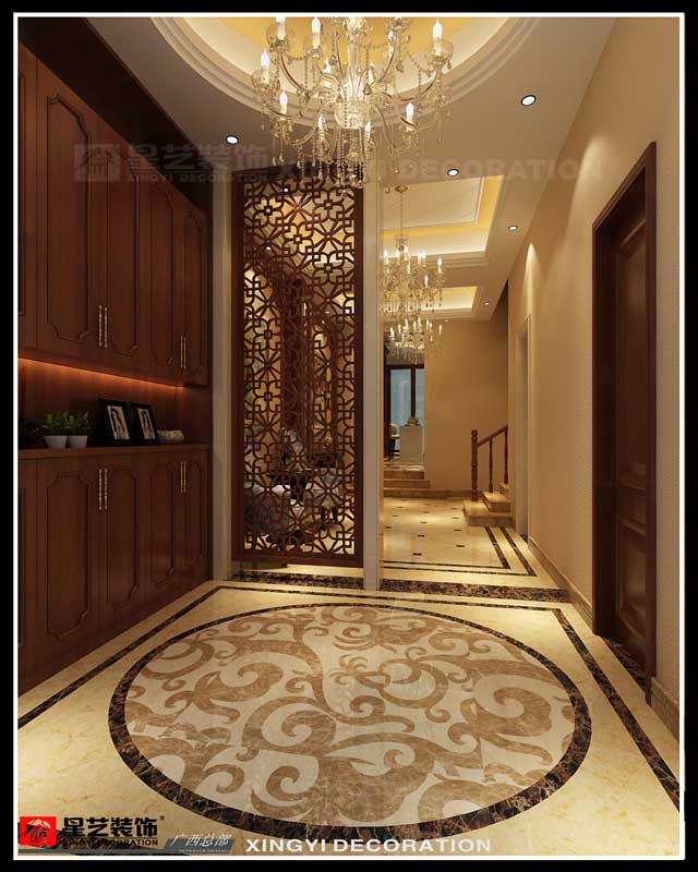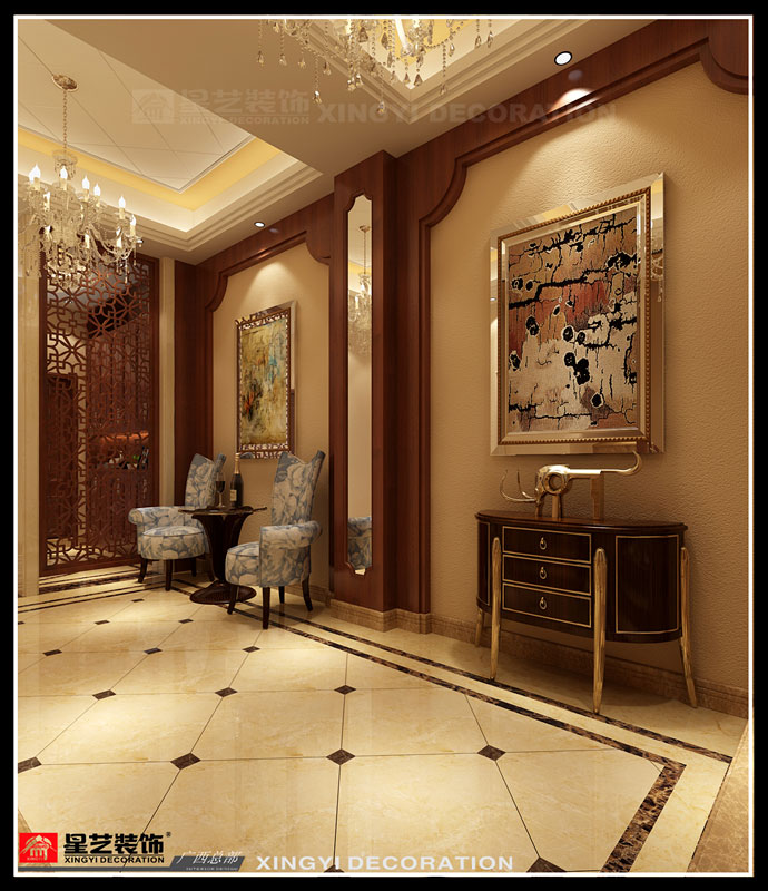 本案室內(nèi)設計上,將六分貴氣,三分靜氣,一分清氣融為一體,體現(xiàn)了美式風格低調(diào)奢華的理念,大量米黃大理石和金黃色石材的運用,奠定了整部作品富麗堂皇的基調(diào)。玄關的凹形石材立面造型,大理石地面拼花,背景立面的石材邊框等無不在步入客廳的第一時間讓你感知一種莊嚴大氣,沙發(fā),茶幾,衣柜,床,書柜,書桌等多采用美式風格。局部以花紋雕刻點綴,以褐色,紅橡木原色為基本色。各類水晶吊燈的運用,與整體風格渾然一體。