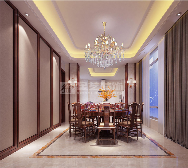 本案設計師用簡約的手法將新中式的韻味表現(xiàn)得既淋漓盡致,線條交匯和諧自然,配以精致的燈飾、古香古色的雕刻和中式桌椅,整個空間看起更多了一份典雅莊重的含蓄之美。