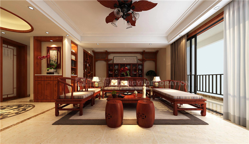 中式的設(shè)計(jì)元素在這里隨處可見,客廳電視背景兩邊的實(shí)木雕花、沙發(fā)背景的古代牌坊造型、古韻十足的中式沙發(fā)、以及餐廳推拉門和柜子門板的中式線條,無不流露出悠悠古風(fēng)。