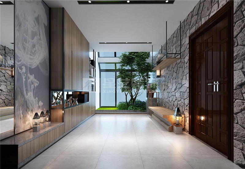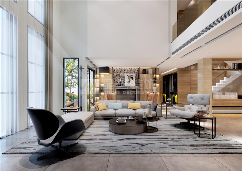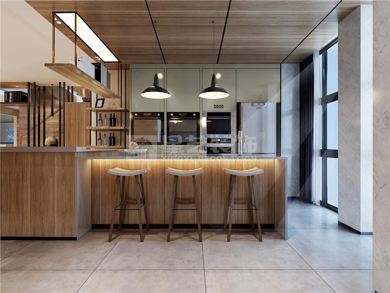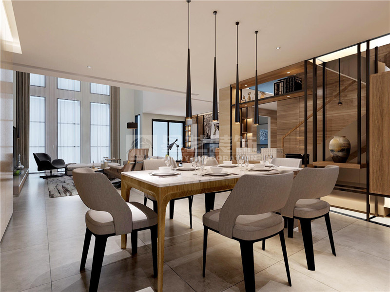 以簡(jiǎn)潔的方式演繹高品質(zhì)室內(nèi)空間設(shè)計(jì)的“輕奢新主義”的新思想。設(shè)計(jì)上,用理性而睿智的態(tài)度演繹空間居住者講究高品質(zhì)且簡(jiǎn)單舒適的生活態(tài)度,家居空間更具表演性。 二樓延續(xù)了一樓“輕奢新主義”的新思想。自然柔軟的櫻桃木遇上了漆黑冷酷不銹鋼板,柔和暖色的臺(tái)燈映襯這自然的黃洞石,讓人能夠設(shè)想到靜謐的夜晚,一本小說,一盞燈,一個(gè)恬靜的夜晚。讓人怎么能不樂享其中,陶醉其中。生活就該有這種靜謐的音調(diào)吧。三樓是主人一直想擁有的一個(gè)兼具休閑,娛樂,運(yùn)動(dòng)的空間。冬日溫暖的壁爐,自然拼貼的火山巖,實(shí)木板上墻,圍合成了一個(gè)讓全家人自得其樂的小空間。