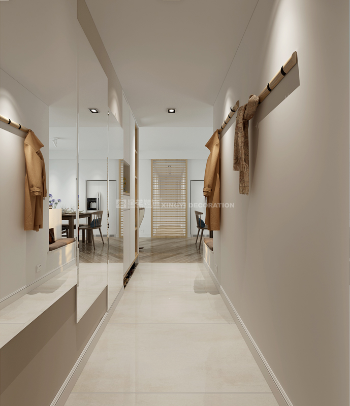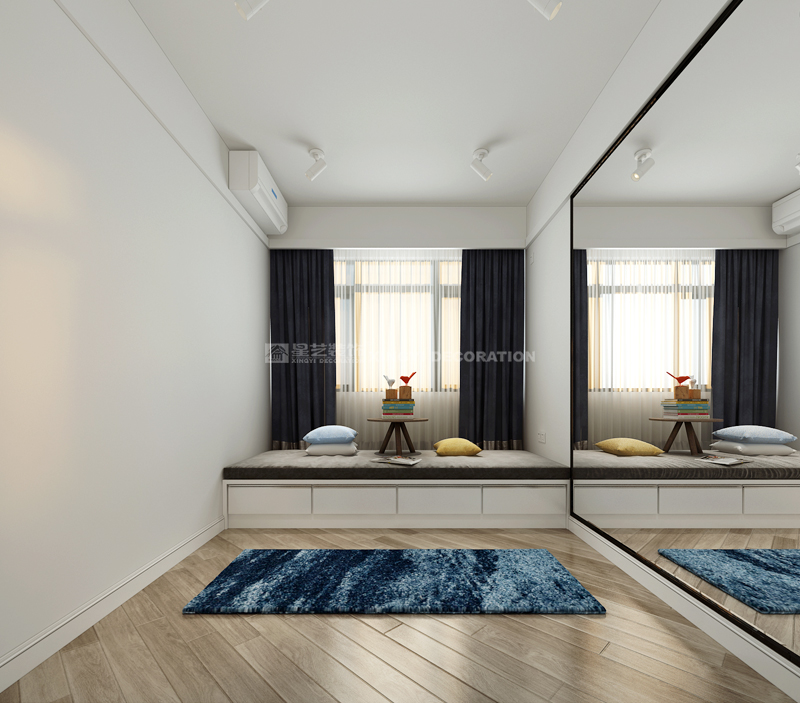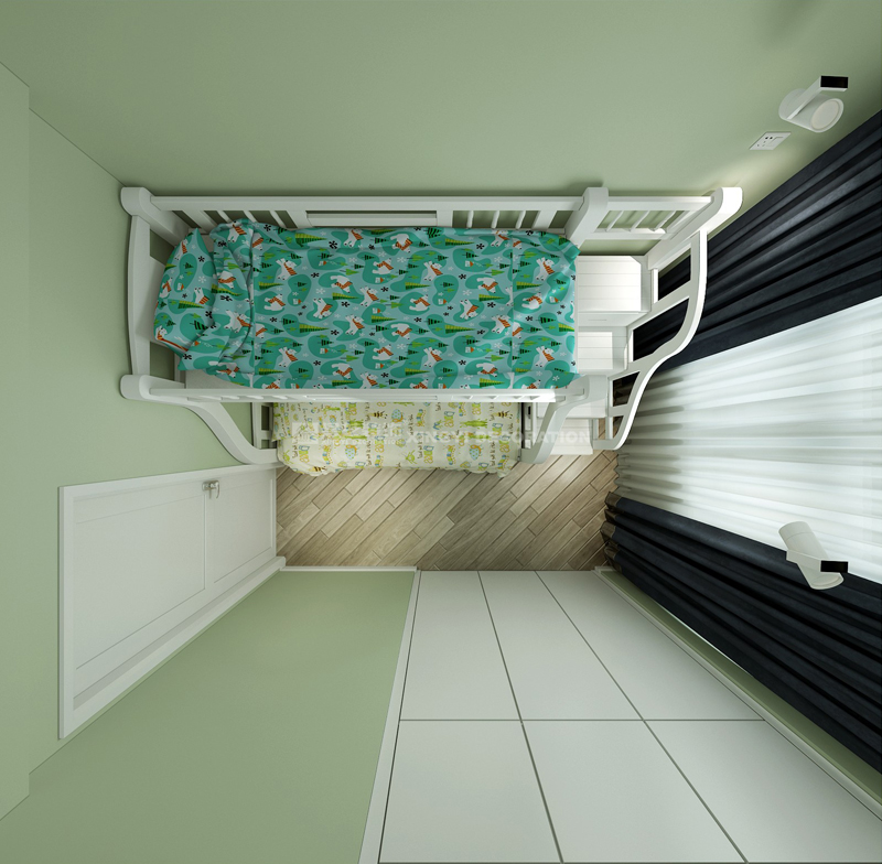 本案設(shè)計師以簡潔明快的北歐設(shè)計風(fēng)格為主調(diào),全面考慮,在總體布局方面,盡量滿足業(yè)主生活上的需求。首先在功能方面,要充分滿足業(yè)主的生活要求,鞋柜是功能方面的一個重要元素,因為入戶過道給人的感覺較窄,因此窄入戶左手邊墻面加銀鏡,從視覺上增加空間感。鞋柜貼著銀鏡做玄關(guān)柜,整個空間整齊干凈??蛷d是交友娛樂中心,懸掛的層板設(shè)計,既大方又有感覺,客廳沙發(fā)背景墻面色彩為咖啡色,屬暖色調(diào)。胡桃木與黑皮革的結(jié)合使得空間大氣又不失時尚,在餐廳和客廳之間的墻面做一個景點,設(shè)計了一個1米*2.4米 到頂?shù)耐评夷靖魯?,不用的時候隔斷就是電視背景的裝飾, 廚房衛(wèi)生間均按現(xiàn)代,舒適,衛(wèi)生,環(huán)保標(biāo)準(zhǔn)進(jìn)行設(shè)計。兒童房突出個性,床后的墻面涂果綠色的多樂士環(huán)保涂料,加以燈光配合,充分顯示青春活力。
