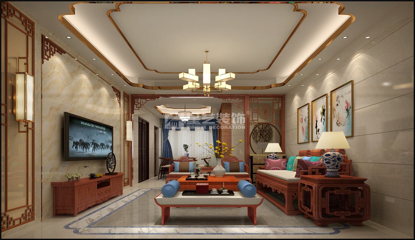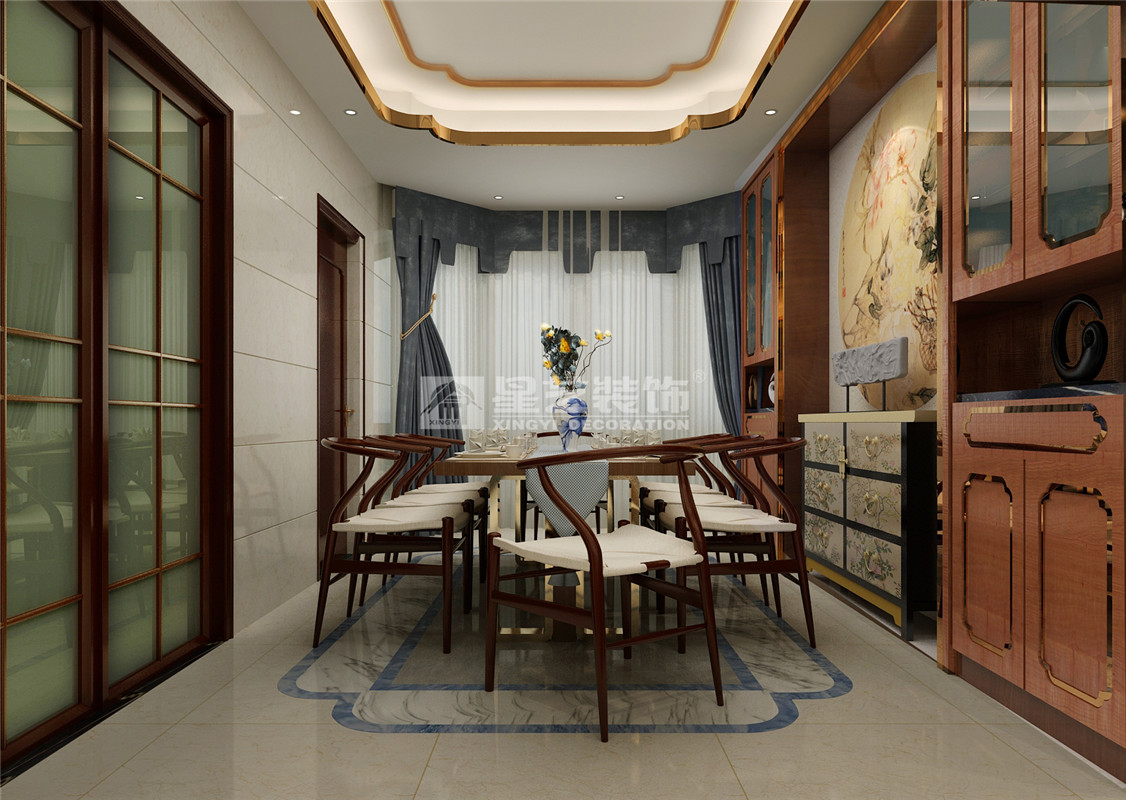 本案講究空間的層次感,在需要隔絕視線的地方,則使用中式的屏風(fēng)或窗欞、中式木門、工藝隔斷、簡約化的中式“博古架”,通過這種新的分隔方式,單元式住宅就展現(xiàn)出中式家居的層次之美。再以一些簡約的造型為基礎(chǔ),添加了中式元素,使整體空間感覺更加豐富,大而不空、厚而不重,有格調(diào)又不顯壓抑。