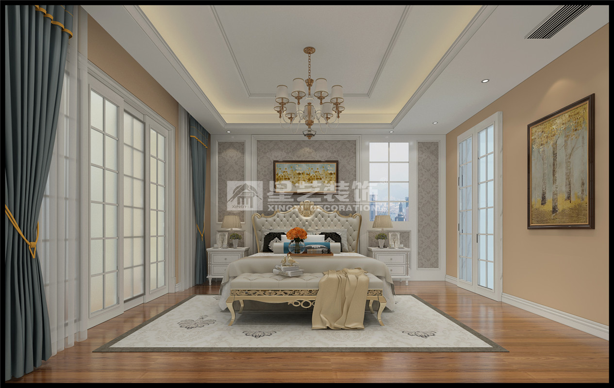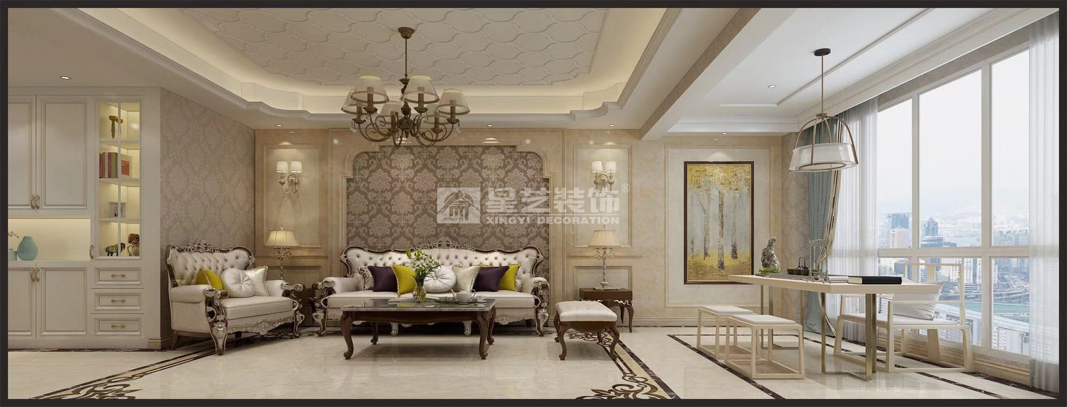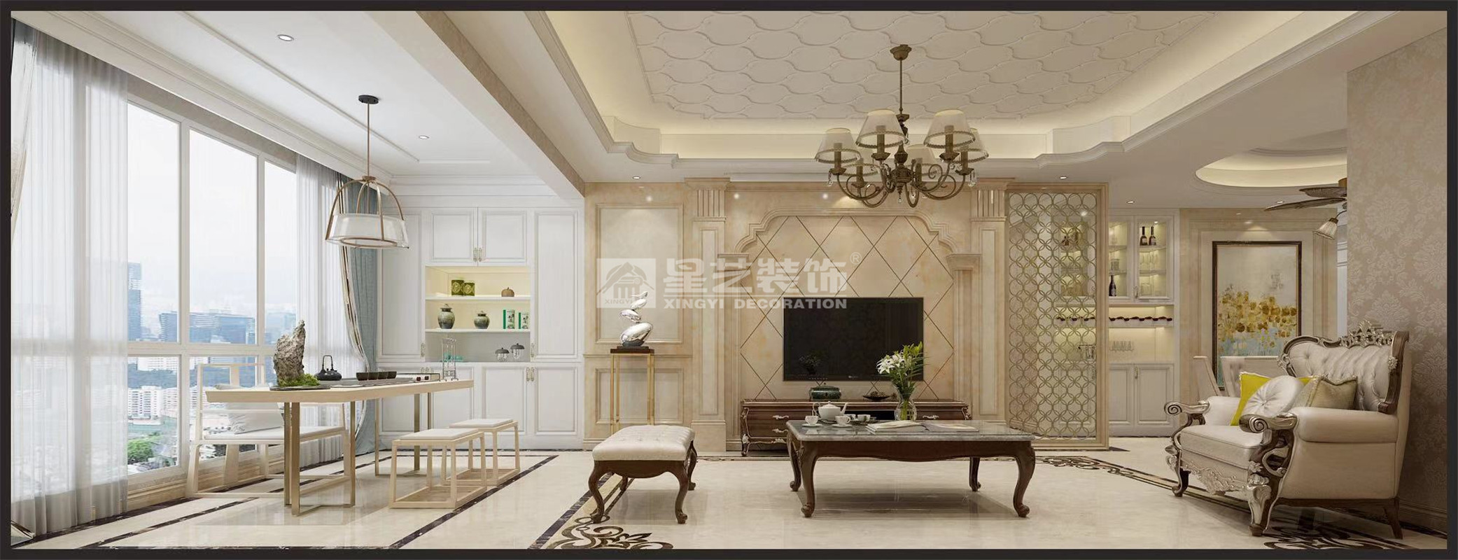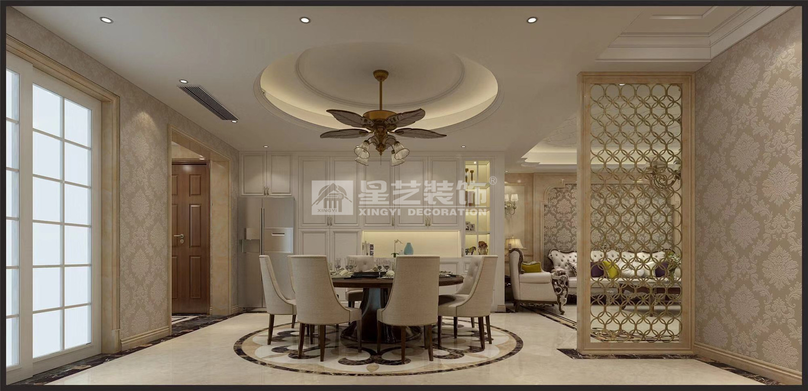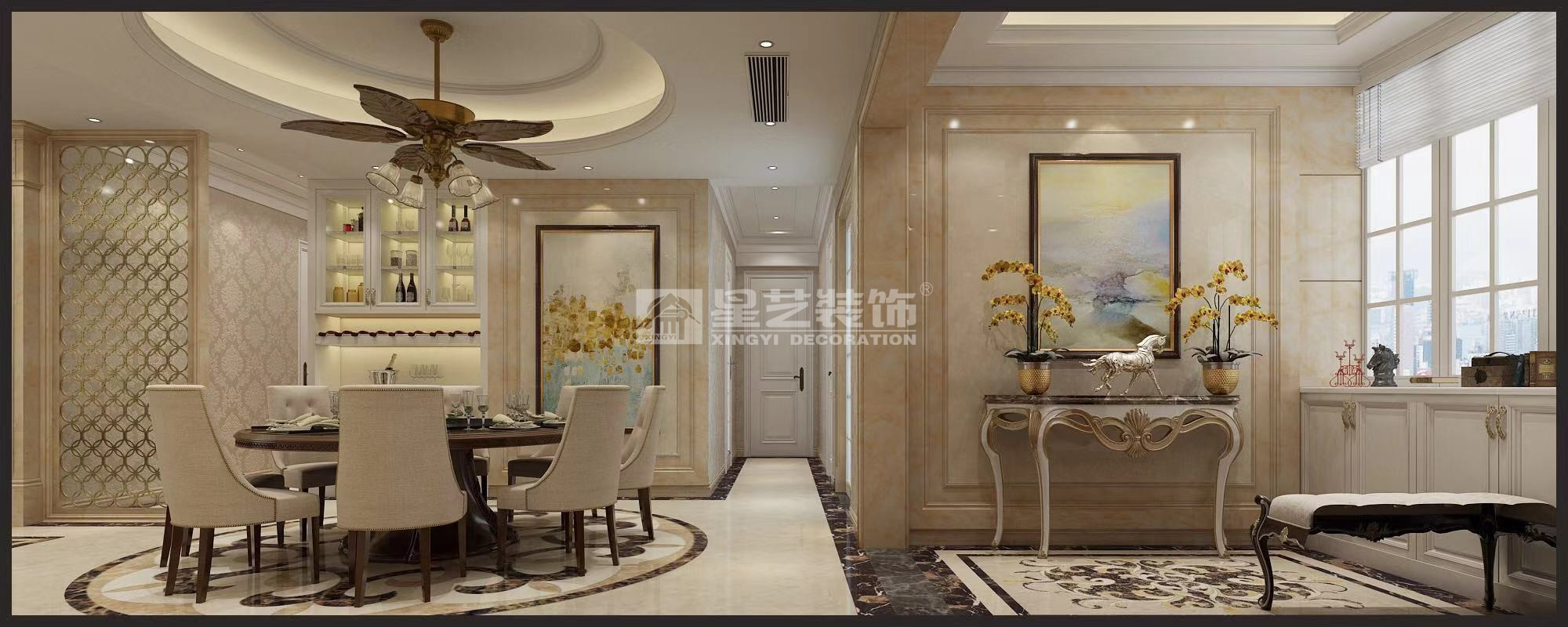 主要用材:水曲柳木飾面,大理石,仿大理石瓷磚,墻布,石材踢腳線,本案為四房二廳二衛(wèi)一廚的平層住宅。為一六口之家為依據(jù)進行設計,結合業(yè)主的一些生活習慣及情況,營造一個溫馨浪漫的家庭環(huán)境,盡量滿足六口之家生活上的需求。在設計上運用了大面積淺色系色調裝飾材料,墻布和墻面大理石的質感融合,歐式格調與浪漫的氛圍結合。