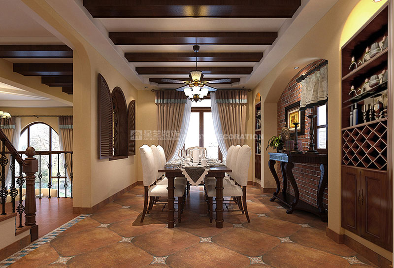 一樓處在原來客廳與廚房餐廳的開放式的大空間里,運用了加法,把原廚房和餐廳移至二樓錯層處,利用拱形牛仔門分隔出六平方的地方預留出了鞋帽間位置,增加了一個拱形門廊來分隔出入戶玄關(guān)、音樂休閑區(qū)及客廳空間;在一樓鋼琴區(qū)的樓梯部分,利用樓梯扶手位置也加建了一道鏤空裝飾墻體,既可置物,也可增加空間的靈動感。拱門是典型的地中海家居元素之一,令空間更顯天然、浪漫。一樓錯層樣做了不少變動,將原來房間和衛(wèi)生間改成開放式廚房,餐廳緊連著戶外的庭院。為了讓家庭更有交流感,在客廳電視墻的右上角設(shè)計窗戶,光線充足之外,更有法式鄉(xiāng)村風味的融洽氛圍;而廚房與餐廳的過渡,就以那幾條自然粗獷的木梁代替。