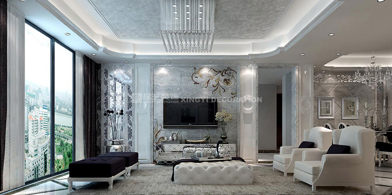 本案地處南寧市柳沙半島,擁有獨特的地理位,地高勢且面向一線江景,可謂居家之風水寶地。業(yè)主是一對新婚的夫妻。以客廳和餐廳及開放式廚房為中軸線貫穿的設計主次分明,通風效果利用到了極致,白色的歐式家具與進口墻布和水刀切割的精致拼花相互搭配,豐富著室內的生活氣息,時尚而又華麗,浮現(xiàn)出一幅美麗的畫面,令人心曠神怡,,同時也是象征著一對新人愛情的神圣與純潔。