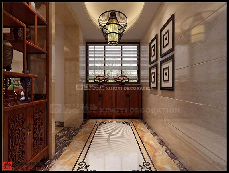 本案例采用拋釉磚(明)與木通花(暗)的對比,加上大理石(硬)與墻布(軟)的搭配,營造出一個明亮,現(xiàn)代的中式之家