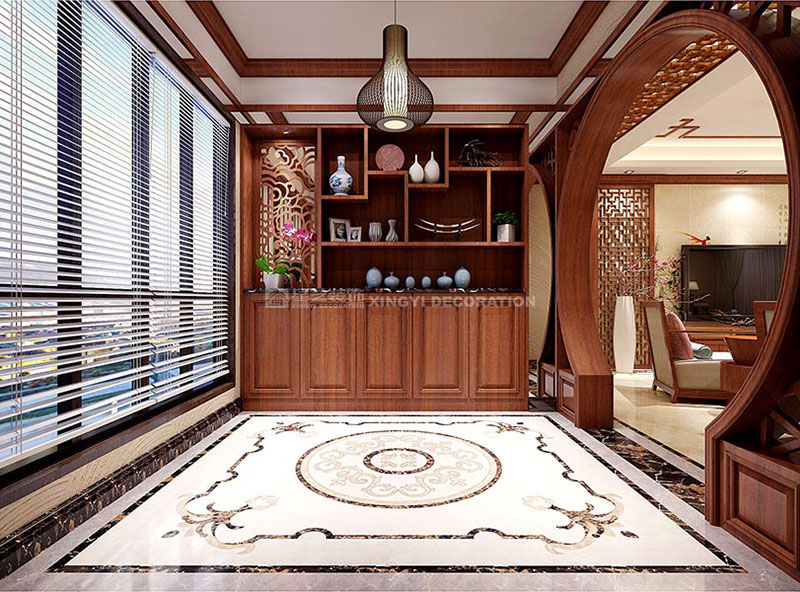人對(duì)一個(gè)空間的感覺(jué)是在前七秒產(chǎn)生,所以入戶區(qū)對(duì)整個(gè)空間的重要性。 進(jìn)入本案例,映入眼簾的是:左邊是小區(qū)花園的美景(把室外的引入,做到室內(nèi)外相交融),右邊是曲線美的月亮門,讓中式空間的延伸更有內(nèi)涵。正對(duì)的是整面的裝飾博古架,擺放著主人精心呵護(hù)的綠植、有旅游帶回來(lái)的飾品擺件、有中式的青花瓷,還有。。。。。。