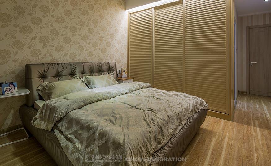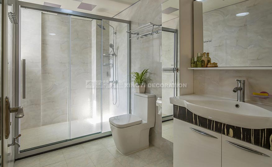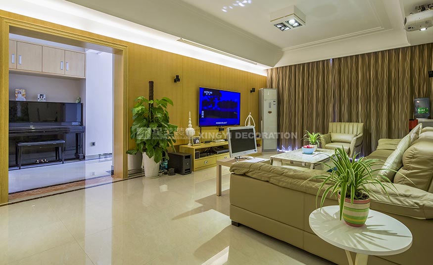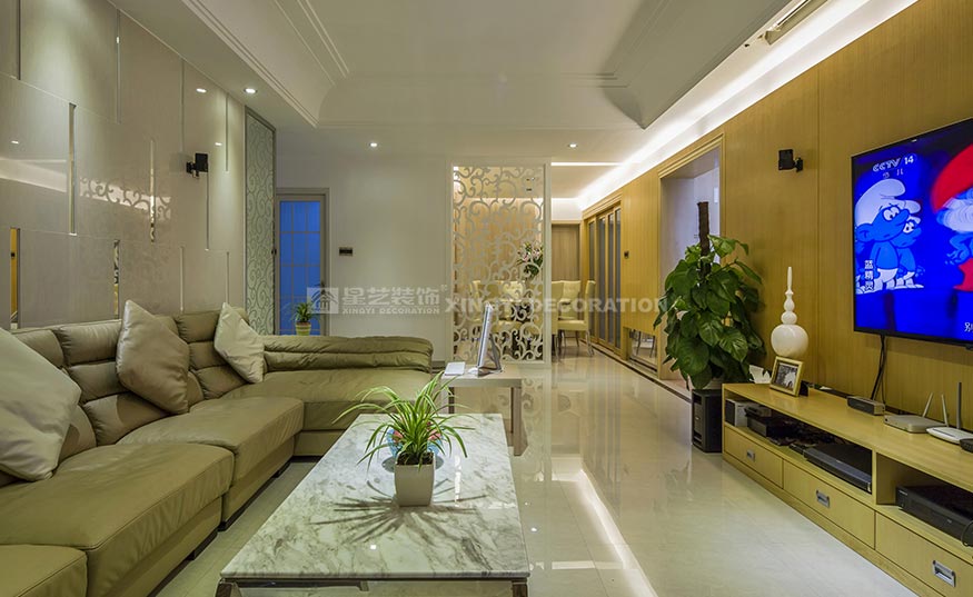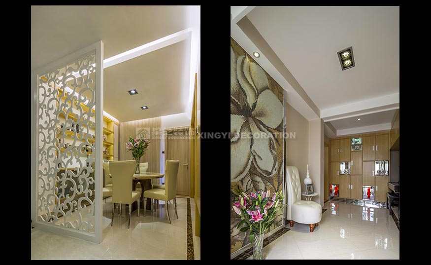 玄關(guān)的面積較大,為了充分利用空間,在與業(yè)主溝通后把原來鋼琴放置在這里,增添了一絲音樂的氣息。魚缸則讓人感受到空間的活力。為了營造玄關(guān)的藝術(shù)氛圍,玄關(guān)處采用了大幅馬賽克裝飾畫,豐富了空白單調(diào)的墻面??蛷d與餐廳原本是相連的,在與業(yè)主溝通后覺得兩者之間太空洞了,空間顯得過于單薄,沒有層次感。為了不影響采光,把客廳和餐廳之間設(shè)計了鏤空圖案隔斷,不僅隔開兩個功能區(qū)域,還能制造出錯落有致的光影,使得光線能隨著人與日光的變換而變換,讓客廳倍具時尚感。隔斷的圖案與客廳背景一致,這樣空間更加對稱,也更加有層次感。客廳的整體色調(diào)為木色,沙發(fā)背景用了冷色調(diào),冷暖對比,在空間里增添一些綠色植物,木色撞上綠色植物,讓人一進入空間就有一種進入大自然的感覺。臥室統(tǒng)一色調(diào)溫馨靜謐,主衛(wèi)采用了現(xiàn)代感極強的光面白色瓷磚,潔具選擇上選擇了白色為主,使空間看起來更加簡潔干凈。