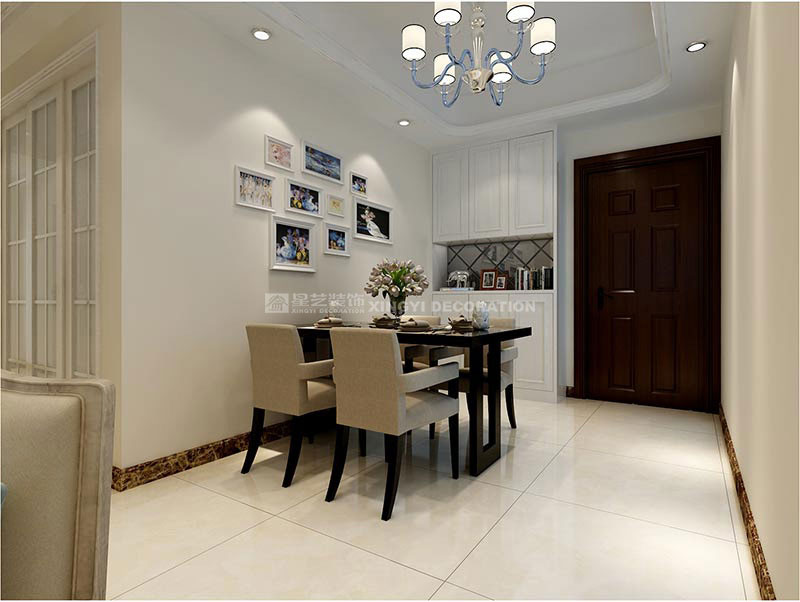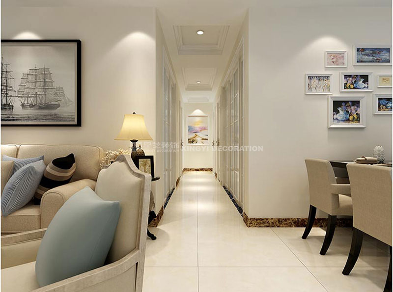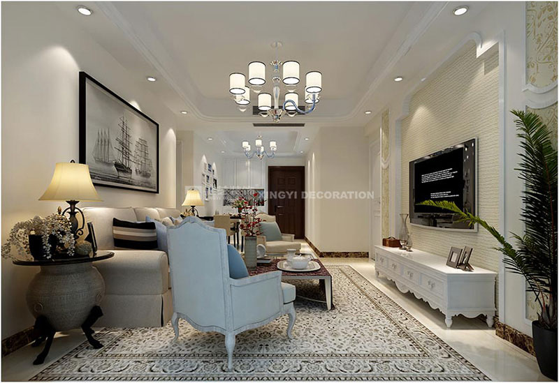 在該案例主要以簡約歐式為主,混搭了地中海特有的造型元素,以白米白色調為主,地中海元素造型的電視背景墻,和弧形的吊頂,糅合的弧型線條,搭配上簡約歐式的家具,明亮的燈光,使整個空間寬闊明亮,溫馨舒適。