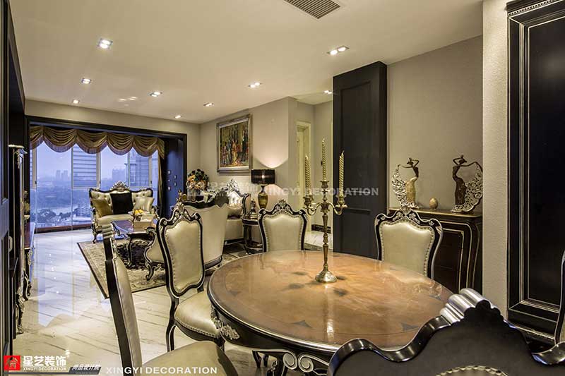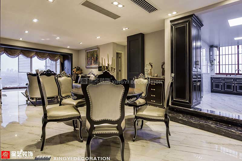 設(shè)計(jì)風(fēng)格古典而有韻律。位于餐廳正中央,擺放有一處能容納六人大圓桌,敞開式廚房,使你無論站在客廳、