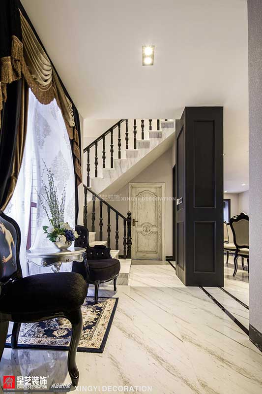 雅士白與黑檀木的黑白組合提升空間對(duì)比度的同時(shí)更帶來貴族的優(yōu)雅簡(jiǎn)約氣息,整個(gè)空間構(gòu)圖大氣雍容,