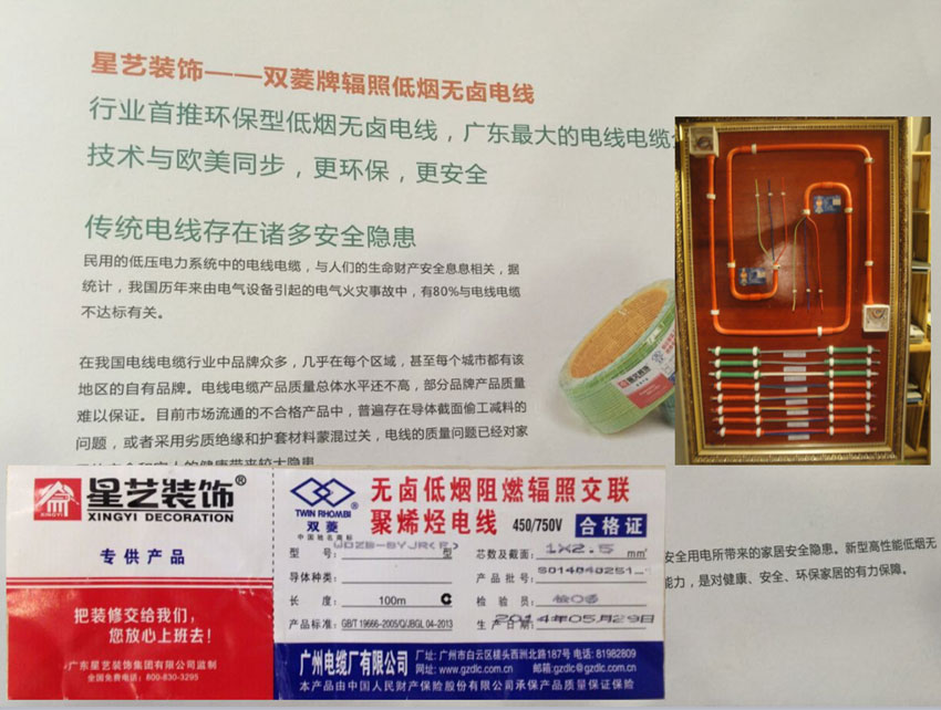 1、強電采用廣州電纜廠有限公司正牌正廠出產(chǎn)低煙無鹵阻燃輻照交聯(lián)聚烯涇雙菱電線,每一卷電線都有“身份證”(代碼)。